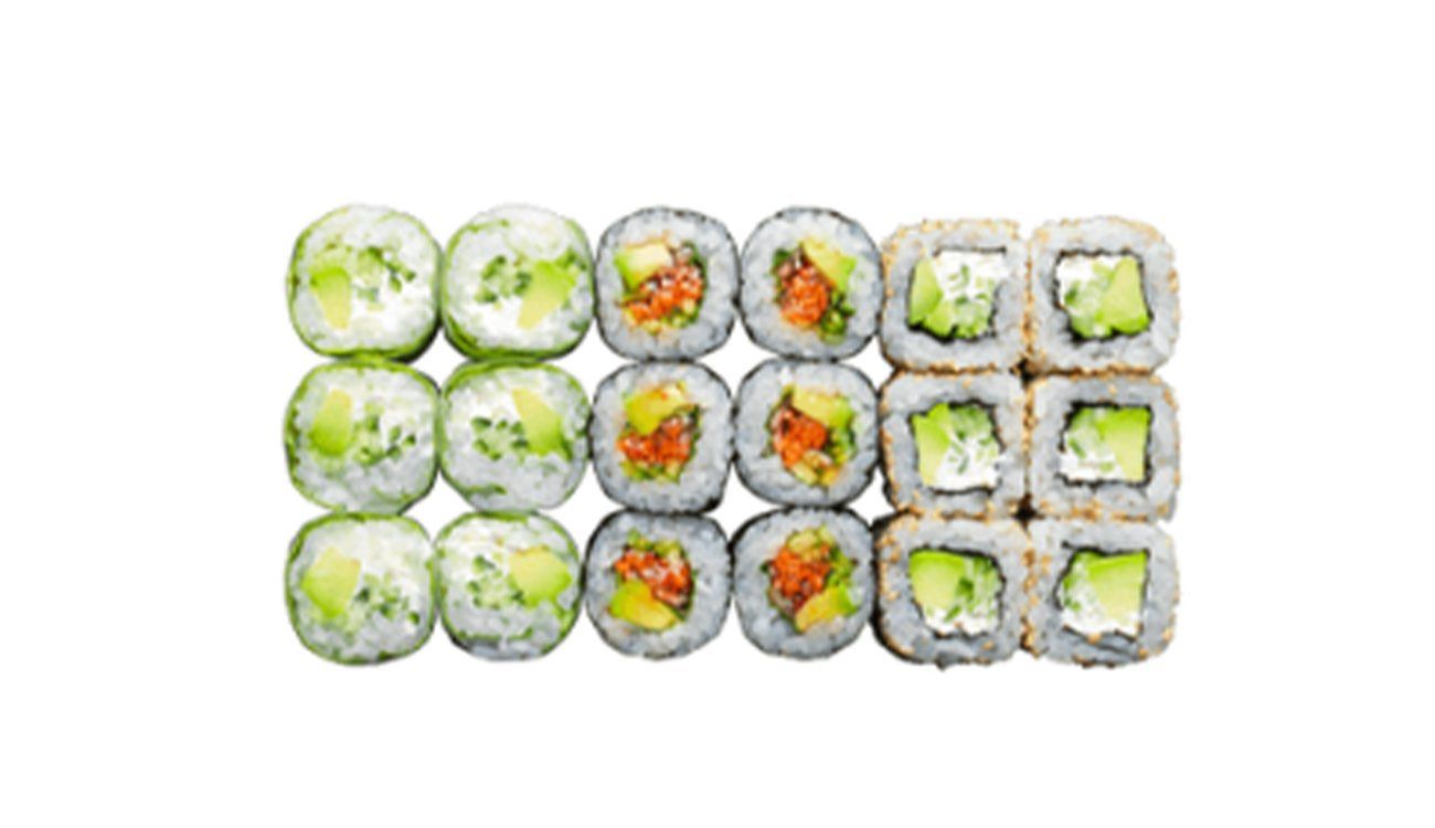 8 Rolls California Saumon avocat,8 Green Rolls Saumon-Avocat,3 Sushis Saumon,3 Sushis Saumon-Cheese, avec sésame