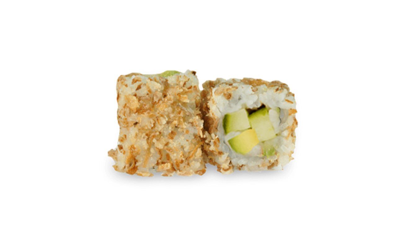 8 Crispy Rolls concombre cheese avocat : feuille d'algue enroulée dans du riz vinaigré recouvert d'oignon frit avec du concombre, fromage et avocat
