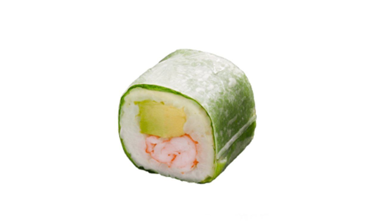 8 Green Rolls crevette avocat : riz vinaigré enroulé d'une feuille de riz et d'une feuille de laitue, crevette cru et avocat