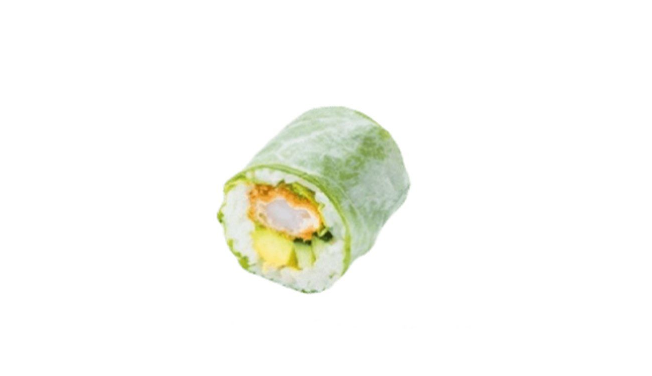 8 Green Rolls crevette tempura : riz vinaigré enroulé d'une feuille de riz et d'une feuille de laitue, crevette tempura et avocat
